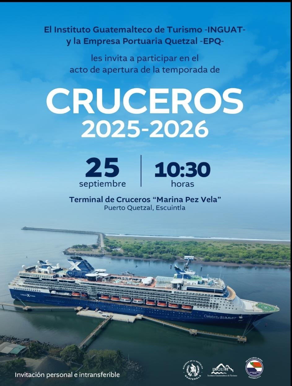 El Instituto Guatemalteco de Turismo (Inguat) y la Empresa Portuaria Quetzal invitan a participar en la apertura de la temporada de Cruceros