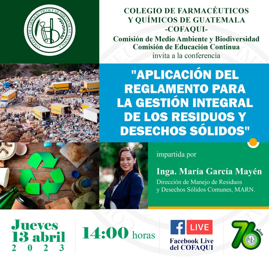 El Colegio de Farmacéuticos y Químicos de Guatemala (Cofaqui), te invitan a participar en la conferencia "Aplicación del reglamento para la gestión integral de los residuos y desechos sólidos".