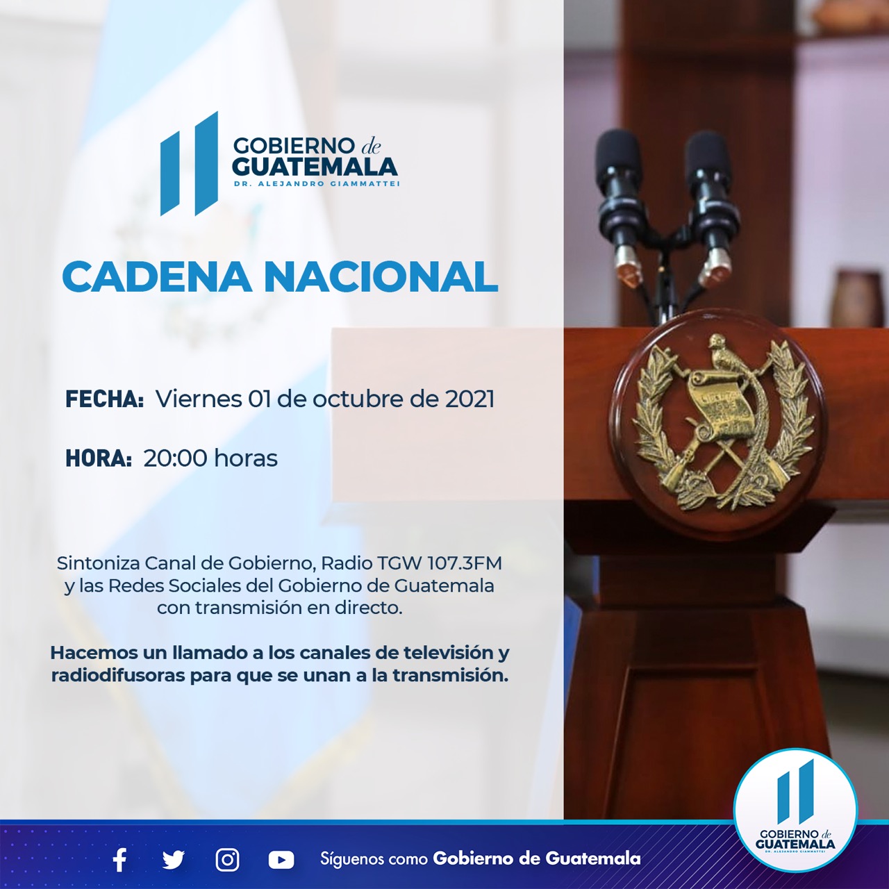 La Secretaría de Comunicación Social de la Presidencia da a conocer la Cadena Nacional que se realizará este viernes 1 de octubre.