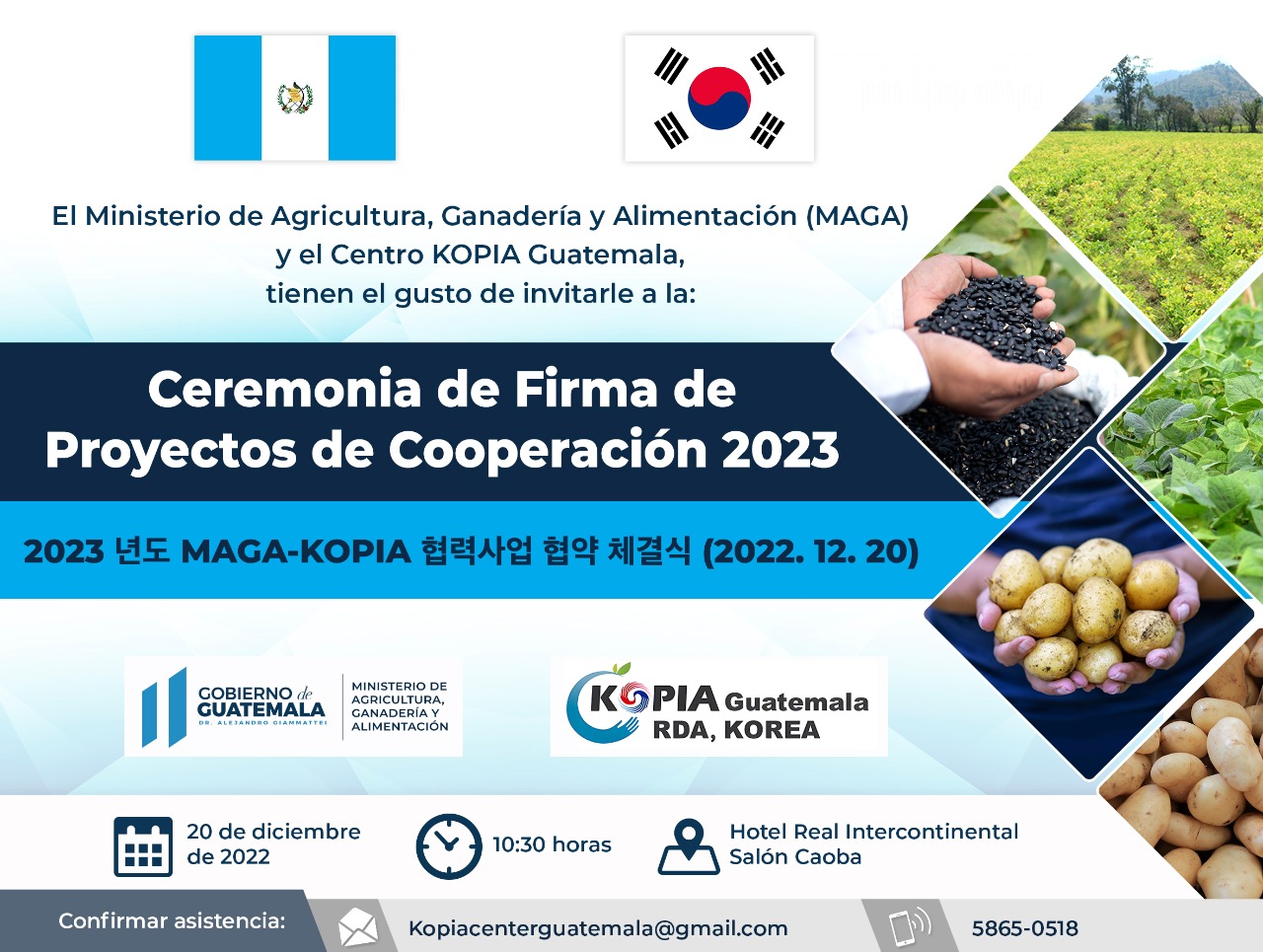 Ceremonia de Firma de Proyectos de Cooperación 2023 entre el Ministerio de Agricultura, Ganadería y Alimentación (MAGA) y el Centro KOPIA Guatemala de Korea.