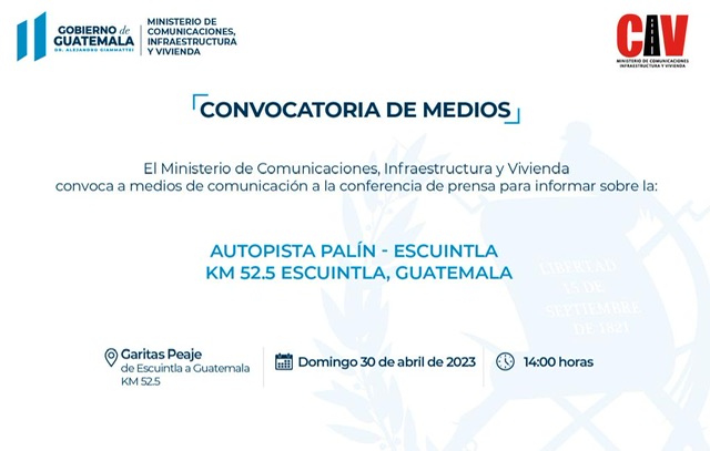 El Ministerio de Comunicaciones, Infraestructura y Vivienda -CIV- convoca a los diferentes medios de comunicación a la conferencia de prensa que se realizará para informar sobre el tema “Autopista PALIN-ESCUINTLA”.