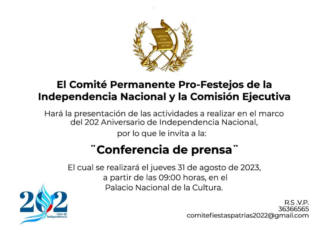 Conferencia de prensa del Comité Permanente Pro-Festejos de la Independencia Nacional y la Comisión Ejecutiva, que hará la presentación de las actividades a realizar en el marco del 202 Aniversario de Independencia Nacional.