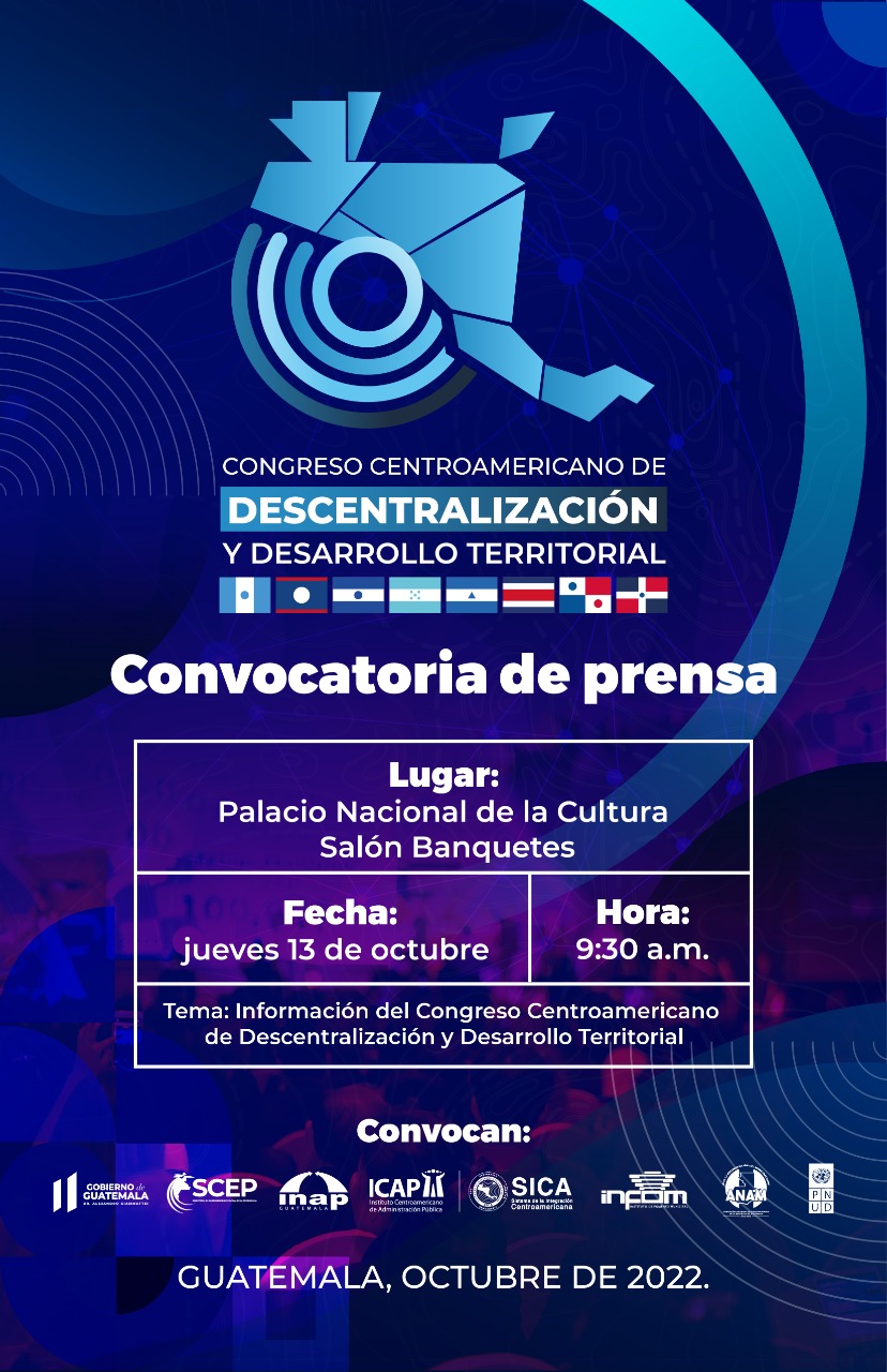 La Presidencia de la República de Guatemala ha instruido a la SCEP para que, en coordinación con el Instituto Nacional de Administración Pública (INAP), la Asociación Nacional de Municipalidades (ANAM), y con el acompañamiento del Instituto Centroamericano de Administración Pública (ICAP), realicen el Congreso Centroamericano “Descentralización y Desarrollo Territorial” con la participación de actores nacionales y regionales, con la finalidad de recuperar la agenda de la descentralización, posicionando una visión de políticas regionales desde la Reunión de Presidentes del Sistema de la Integración Centroamericana (SICA).