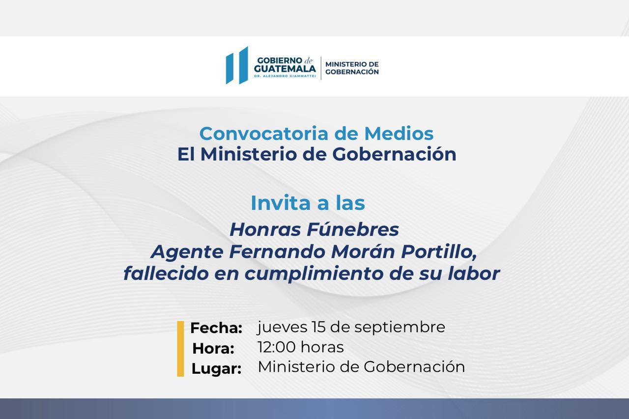 Convocatoria a medios de comunicación a las honras fúnebres del agente de PNC, Fernando Morán Portillo, fallecido en el cumplimiento de su deber.