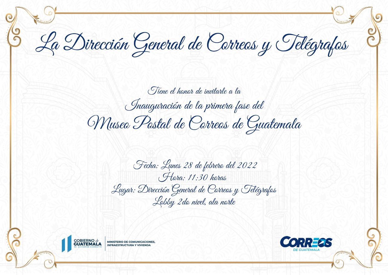 La Dirección General de Correos y Telégrafos de Guatemala invita a los medios de comunicación a la inauguración de la primera fase del Museo Postal de Correos de Guatemala.