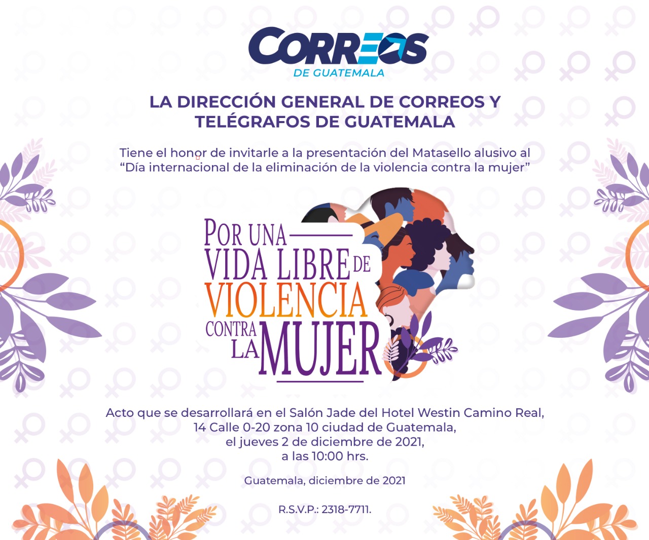 La Dirección General de Correos y Telégrafos de Guatemala invitan a la presentación del Matasello alusivo al "Día internacional de la eliminación de la violencia contra la mujer".