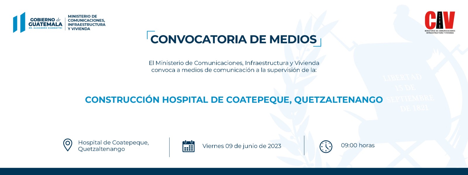 El Ministerio de Comunicaciones, Infraestructura y Vivienda -CIV-, convoca a medios de comunicación a la supervisión que harán las autoridades de esta cartera a la construcción del Hospital de Coatepeque, Quetzaltenango.