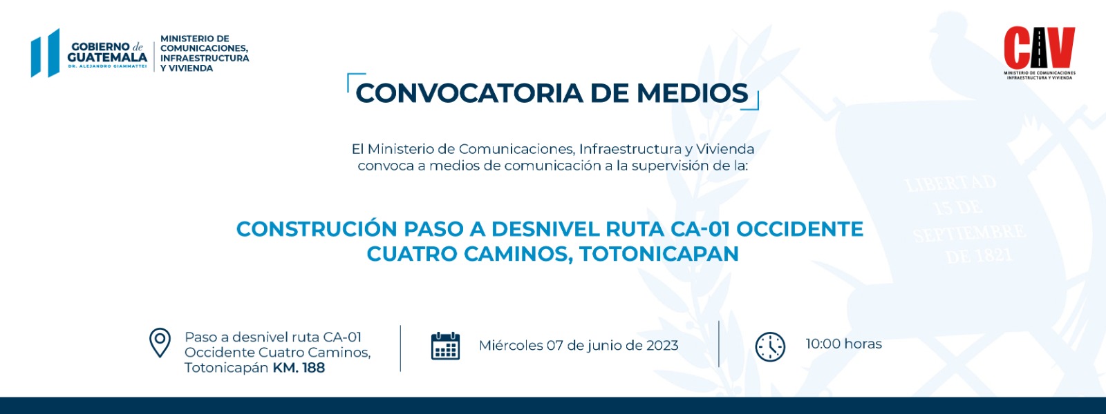 El Ministerio de Comunicaciones, Infraestructura y Vivienda -CIV-, convoca a medios de comunicación a la supervisión que realizarán las autoridades de esta cartera en la construcción del Paso a Desnivel ubicado en la Ruta CA-01 Occidente, Cuatro Caminos, Totonicapán.
