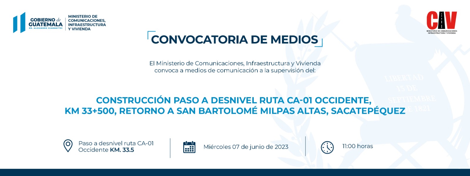 El Ministerio de Comunicaciones, Infraestructura y Vivienda -CIV-, convoca a medios de comunicación a la supervisión que realizarán las autoridades de esta cartera en la construcción del Paso a Desnivel Ruta CA-01 Occidente, retorno a San Bartolomé Milpas Altas, Sacatepéquez.