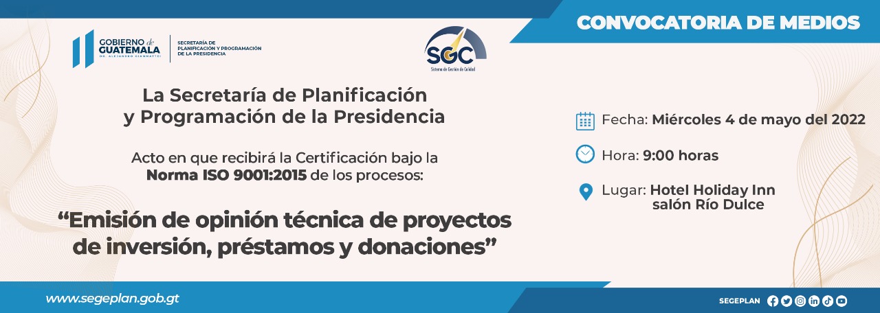 La Secretaría de Planificación y Programación de la Presidencia (SEGEPLAN), recibirá la certificación bajo la Norma ISO: 9001:2015 de los procesos de "Emisión de Opinión Técnica de proyectos de Inversión, Préstamos y Donaciones"