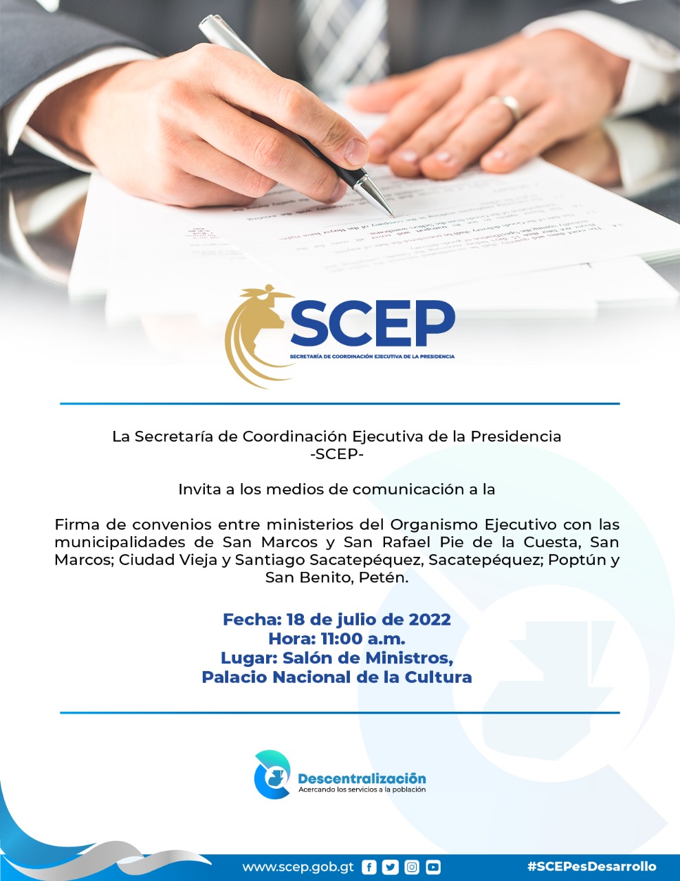 En el marco de la descentralización del Organismo Ejecutivo, siendo esta una de las 50 metas de la Política General de Gobierno del presidente Alejandro Giammattei, se realizará la suscripción de convenios de Cooperación Interinstitucional entre instituciones del Organismo Ejecutivo y las municipalidades de San Marcos y San Rafael Pie de la Cuesta, San Marcos; Ciudad Vieja y Santiago Sacatepéquez, Sacatepéquez; Poptún y San Benito, Petén, con el objetivo de lograr una delegación completa de competencias a mediano plazo en las referidas localidades.