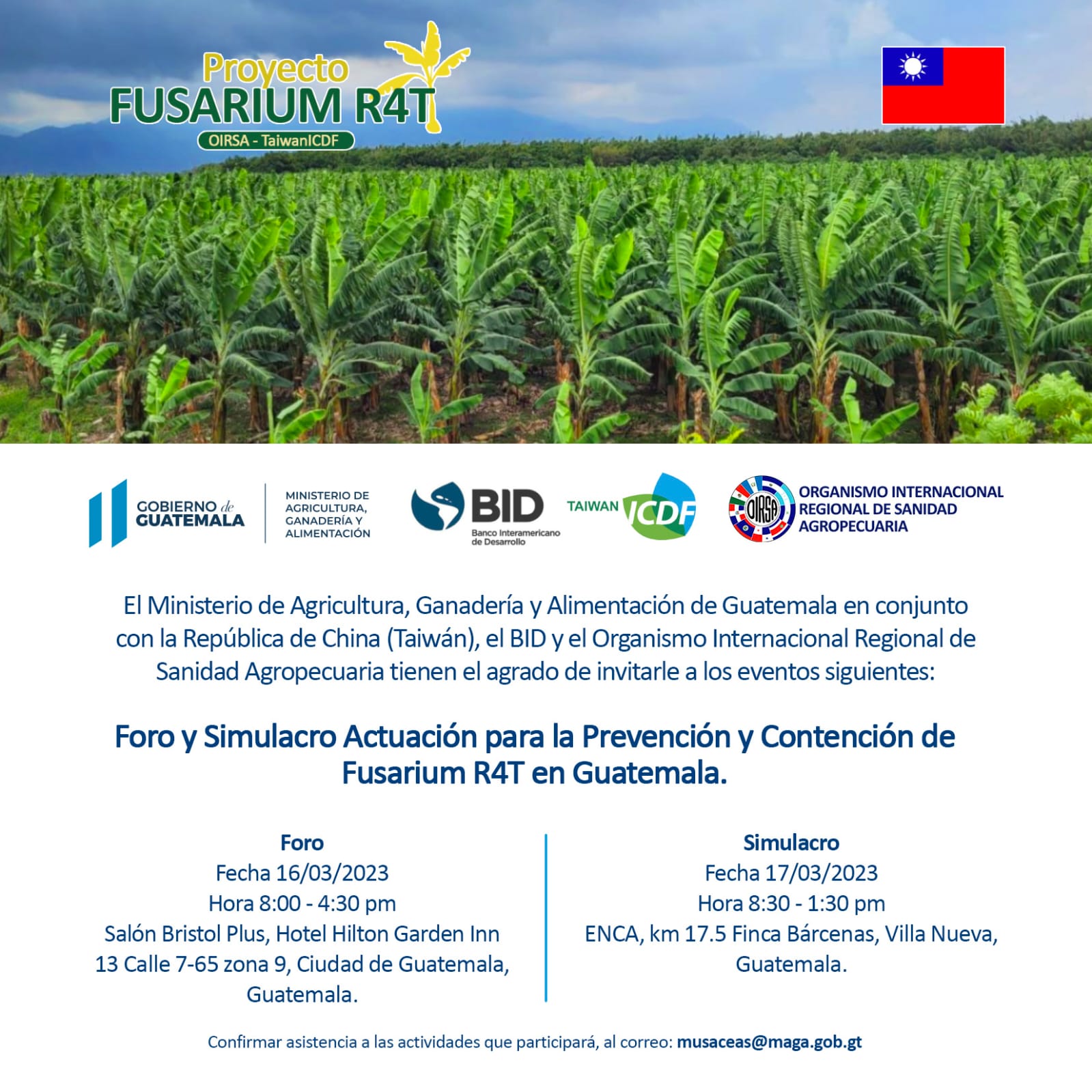 El objetivo es desarrollar un espacio de discusión y análisis sobre las acciones a implementar en la región con relación a la prevención de Fusarium Raza 4 Tropical con el apoyo de MAGA, TaiwanICDF, Banco Interamericano de Desarrollo (BID) y OIRSA, además de la articulación de esfuerzos entre integrantes de la cadena productiva de musáceas en Guatemala.