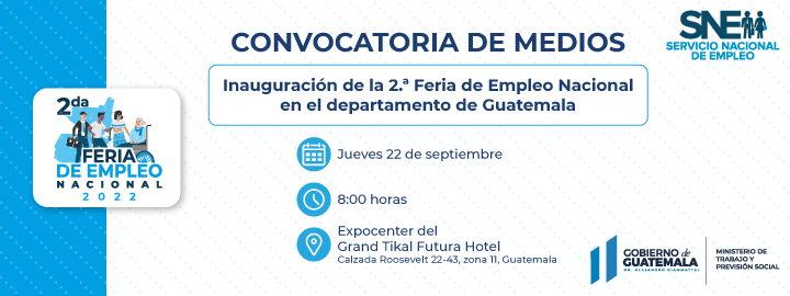 Inauguración de la 2da Feria de Empleo Nacional en el departamento de Guatemala, se tendrá a disposición más de 1,300 vacantes para el departamento de Guatemala y más de 3,000 plazas a nivel nacional.