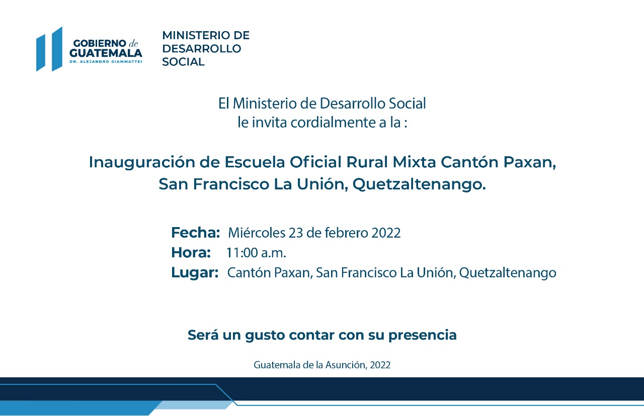 El Ministerio de Desarrollo Social, MIDES, invita a la inauguración de la Escuela Oficial Rural Mixta, Cantón Paxan, San Francisco La Unión, Quetzaltenango.