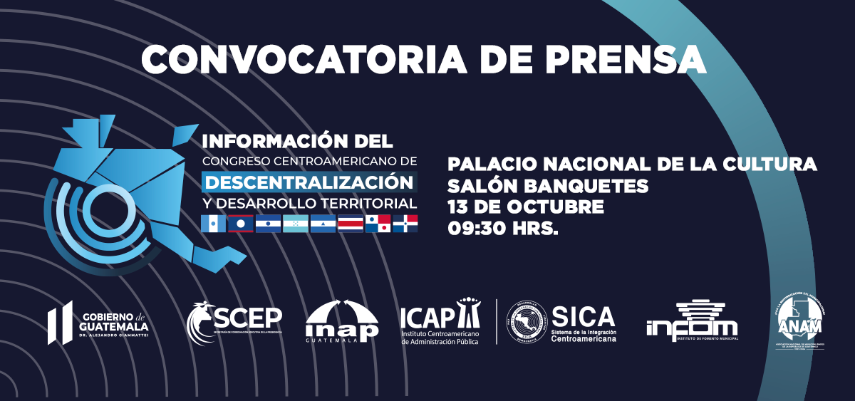 La Presidencia de la República de Guatemala ha instruido a la SCEP para que, en coordinación con el Instituto Nacional de Administración Pública (INAP), la Asociación Nacional de Municipalidades (ANAM), y con el acompañamiento del Instituto Centroamericano de Administración Pública (ICAP), realicen el Congreso Centroamericano “Descentralización y Desarrollo Territorial” con la participación de actores nacionales y regionales, con la finalidad de recuperar la agenda de la descentralización, posicionando una visión de políticas regionales desde la Reunión de Presidentes del Sistema de la Integración Centroamericana (SICA).