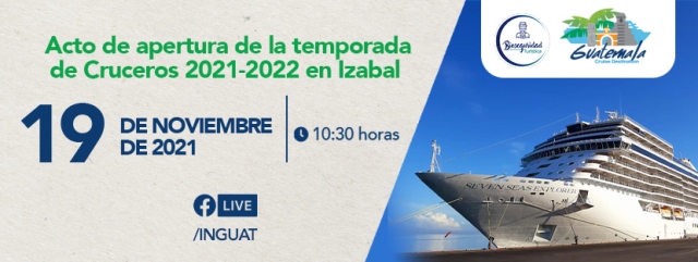 El INGUAT Y EMPORNAC tienen el gusto de invitar a los medios de comunicación al acto de inicio de la temporada de cruceros 2021-2022 en el Atlántico guatemalteco. Esta actividad se desarrollará en el Centro de Atención al Visitante -EMPORNAC-.