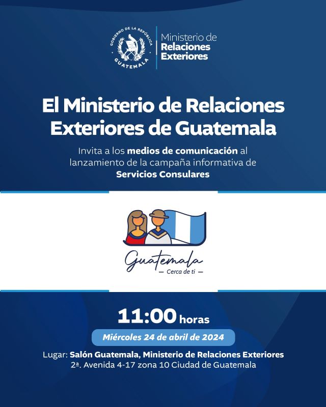 El Ministerio de Relaciones Exteriores lanza la campaña informativa: "Guatemala cerca de ti", una iniciativa que tiene como objetivo primordial facilitar el conocimiento y acceso de los servicios consulares a los connacionales en el extranjero, así como promover una ciudadanía sin fronteras.