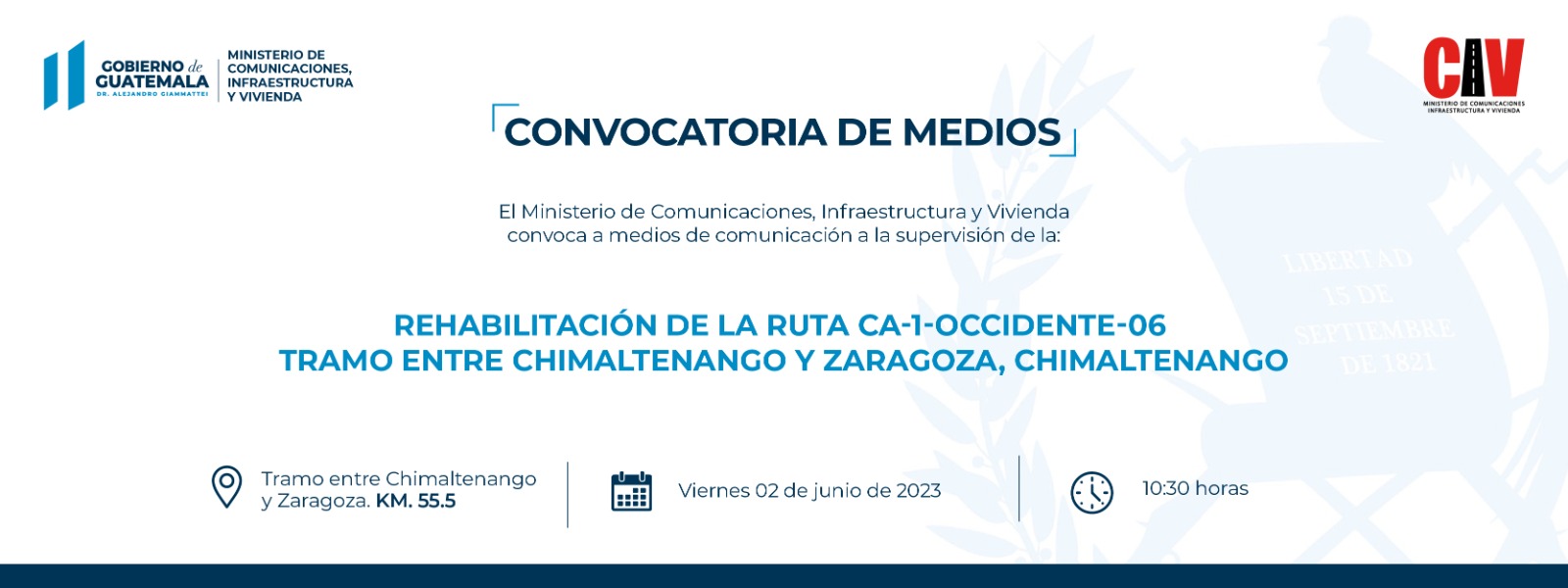 El Ministerio de Comunicaciones, Infraestructura y Vivienda -CIV- convoca a medios de comunicación a participar de la supervisión de la rehabilitación de la Ruta CA-1-Occidente-06, Tramo entre Chimaltenango-Zaragoza, Chimaltenango.