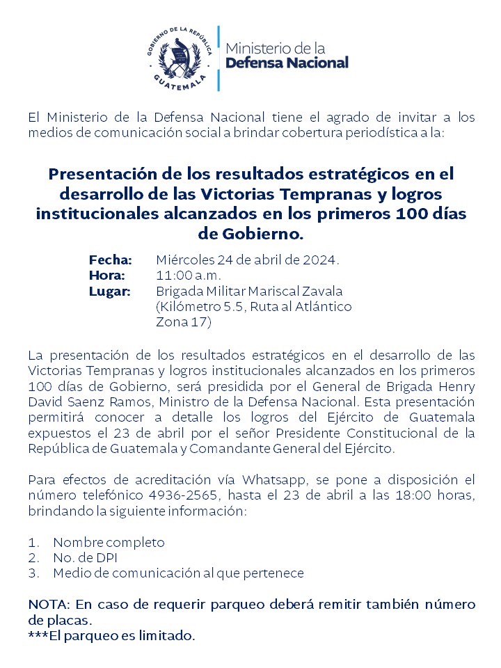 La presentación de los resultados estratégicos en el desarrollo de las Victorias Tempranas y logros institucionales alcanzados en los primeros 100 días de Gobierno, será presidida por el General de Brigada Henry David Saenz Ramos, Ministro de la Defensa Nacional. Esta presentación permitirá conocer a detalle los logros del Ejército de Guatemala expuestos el 23 de abril por el señor Presidente Constitucional de la República de Guatemala y Comandante General del Ejército.