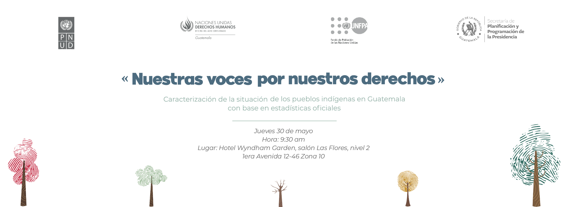 la presentación pública del estudio Nuestras voces por nuestros derechos, caracterización de la situación de los pueblos indígenas en Guatemala con base en estadísticas oficiales Este evento se llevará a cabo el jueves 30 de mayo a las 9:30am en el Hotel Wyndham Garden, salón Las Flores, nivel 2, 1era Avenida 12-46 Zona 10. Agradecemos confirmar su asistencia llenando el siguiente formulario https://bit.ly/estudioNuestrasVoces