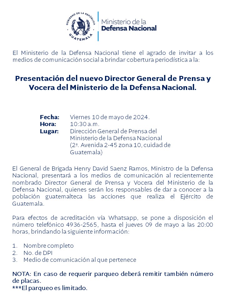 El General de Brigada Henry David Saenz Ramos, Ministro de la Defensa Nacional, presentará a los medios de comunicación al recientemente nombrado Director General de Prensa y Vocera del Ministerio de la Defensa Nacional, quienes serán los responsables de dar a conocer a la población guatemalteca las acciones que realiza el Ejército de Guatemala.