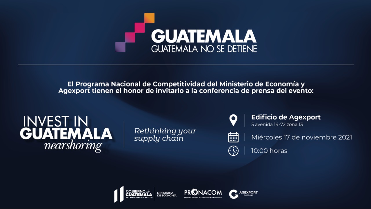 El Gobierno de Guatemala y el Sector Privado a través de la iniciativa "Guatemala no se Detiene" le invitar a participar en la conferencia de prensa para presentar el evento Invest in Guatemala, Nearshoring 2021: Rethinking your supply chain.
