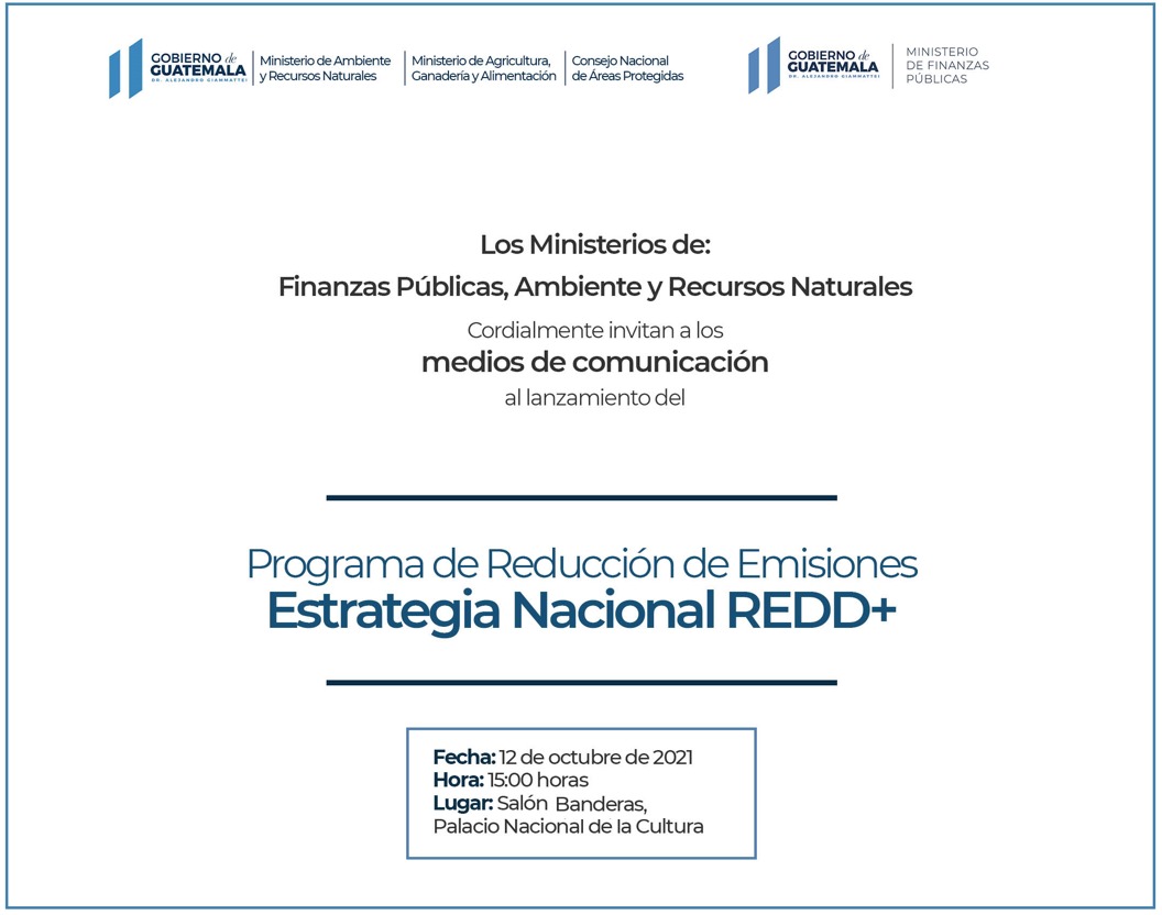 El Ministerio de Ambiente y Recursos Naturales convoca a los medios de comunicación a la presentación del Programa de Reducción de Emisiones y la Estrategia Nacional REDD+, en la que participará el presidente Alejandro Giammattei, el ministro de Ambiente y Recursos Naturales, Mario Rojas Espino, y el ministro de Finanzas, Álvaro González, así como representantes de entidades internacionales y nacionales.
