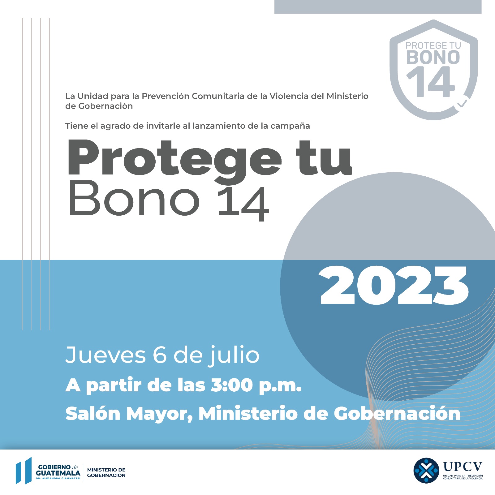 Proteje tu Bono 14 jueves 6 de julio A partir de las 3:00 pm Salón Mayor, Ministerio de Gobernación