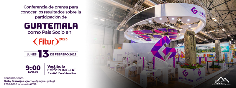 El Instituto Guatemalteco de Turismo tiene el gusto de invitar a los medios de comunicación a la conferencia de prensa para presentar los resultados sobre la participación de Guatemala como País Socio en FITUR 2023. A realizarse el lunes 13 de febrero de 2023 a partir de las 09:00hrs en el vestíbulo del INGUAT.