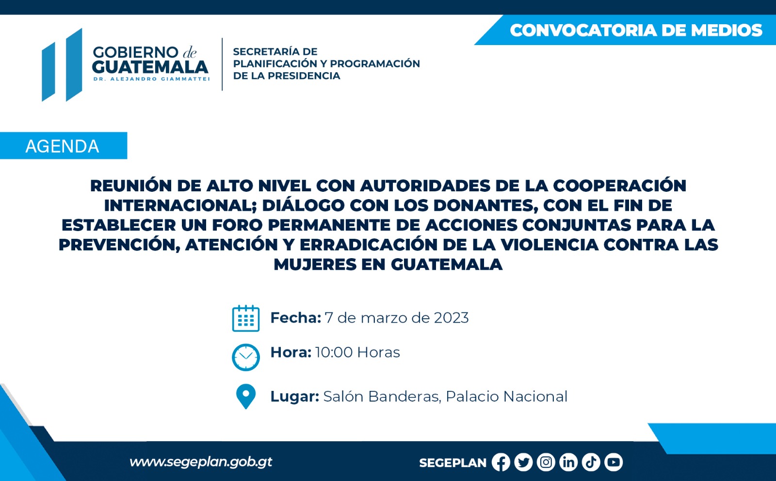 Reunión de alto nivel con autoridades de la cooperación internacional; diálogo con los donantes, con el fin de establecer un foro permanente de acciones conjuntas para la prevención, atención y erradicación de la violencia contra las mujeres en Guatemala