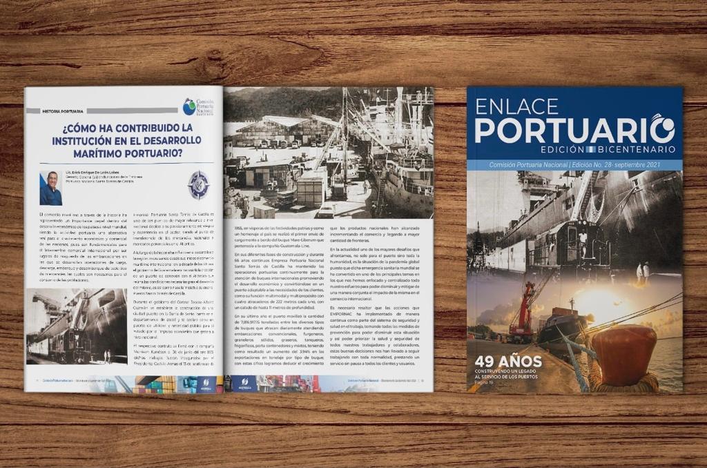 Esta revista se considera una ventana importante para promover y difundir la cultura portuaria, además de compartir temas transcendentales para el sector económico y marítimo portuaria a nivel local y regional; la revista Enlace Portuario Edición Especial se ha trabajado en conmemoración de los 200 años de independencia de Guatemala 1821 - 2021 en el contexto marítimo Portuario y que tendrá alcance y distribución en la región centroamericana.