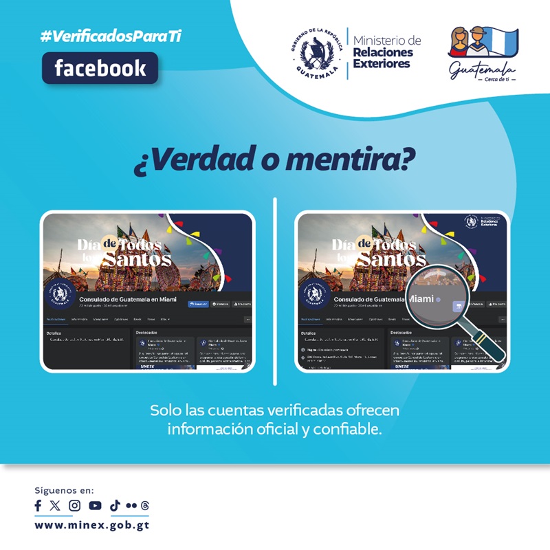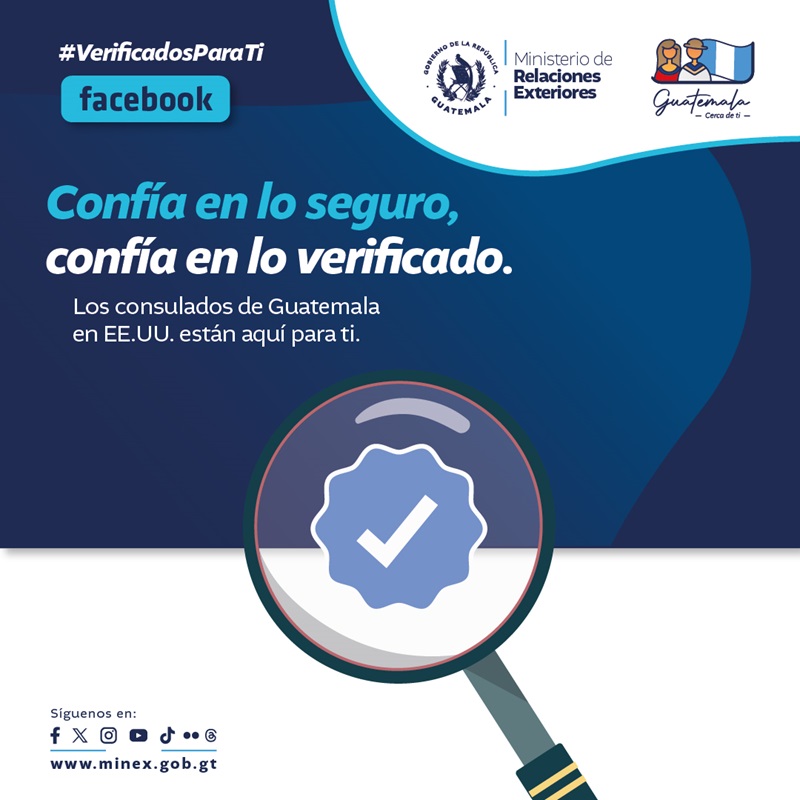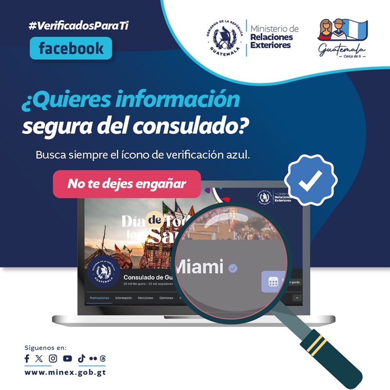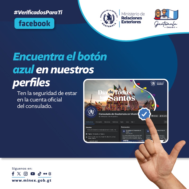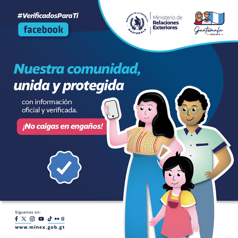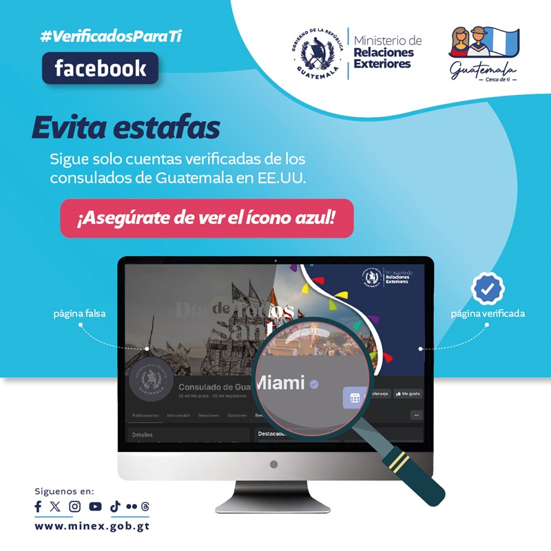 Guatemala, 5 de diciembre de 2024. Como parte de la campaña #GuatemalaCercaDeTi, el Ministerio de Relaciones Exteriores (MINEX) difundirá a través de las redes sociales de sus Misiones Diplomáticas y Consulares una serie de publicaciones para alertar sobre la importancia de seguir cuentas oficiales de la Cancillería y evitar estafas.