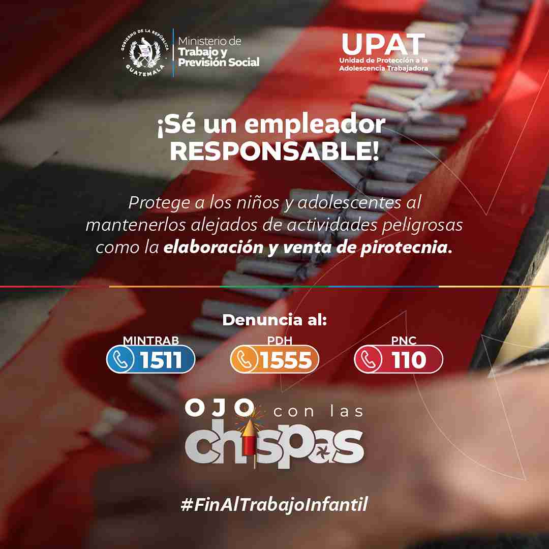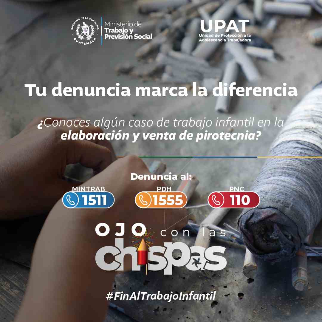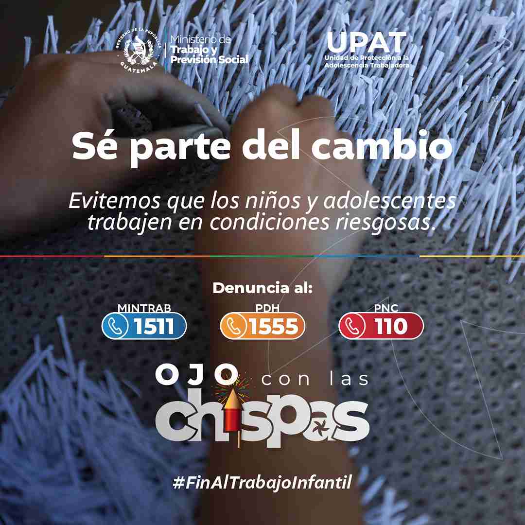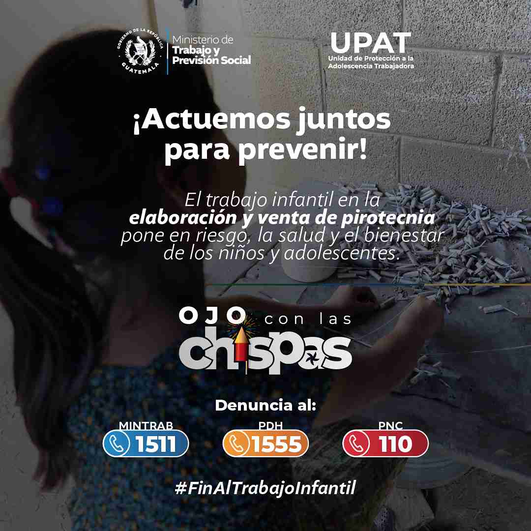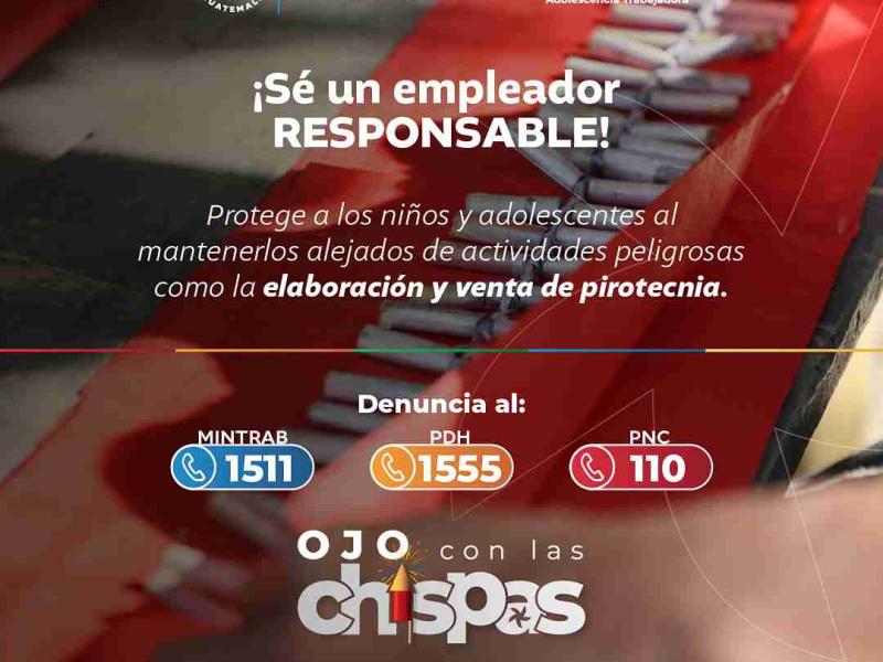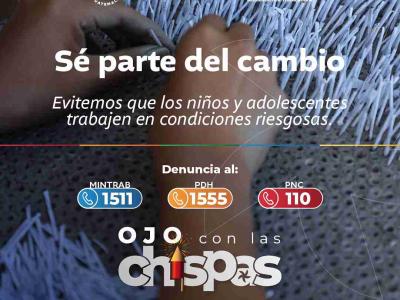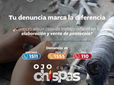 Con el objetivo de prevenir y erradicar el trabajo infantil, especialmente en actividades peligrosas relacionadas con la elaboración, producción y venta de pirotecnia, el Ministerio de Trabajo y Previsión Social (MINTRAB) lanzó la campaña #OjoConLasChispas. Esta iniciativa, impulsada con el apoyo de diversas instituciones, se difunde a través de plataformas sociales digitales, radiales y medios locales y nacionales.