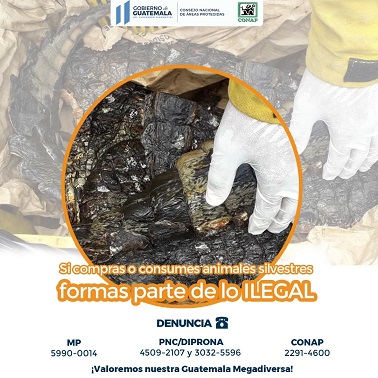 El Consejo Nacional de Áreas Protegidas -CONAP- a la población en general reitera que, colectar, transportar, intercambiar o comercializar, ejemplares vivos o muertos, partes o derivados de animales silvestres, es un delito tipificado en la Ley de Áreas Protegidas, Decreto 4-89 del Congreso de la República de Guatemala, cuya sanción corresponde de 5 a 10 años de prisión y multa de Q10,000.00 a Q20,000.00 quetzales.