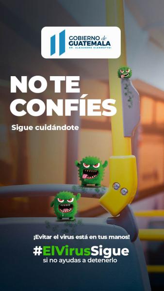 Con el objetivo de previnir el virus covid19 el Gobierno de Guatemala lanza la campaña: No Te Confies. Tiene como objetivo prinicipal que la población no se confie en sus actividades diarias y mantenga las medidas de prevención.