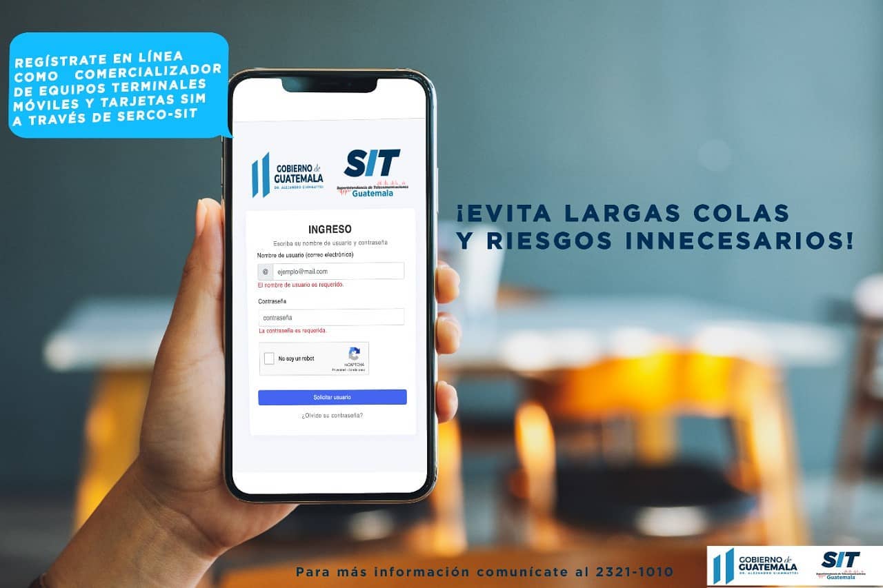 Regístrate en línea como Comercializador de Equipos Terminales móviles y Tarjeta SIM a través de SERCO-SIT, ingresando a www.sit.gob.gt en la pestaña Portal.