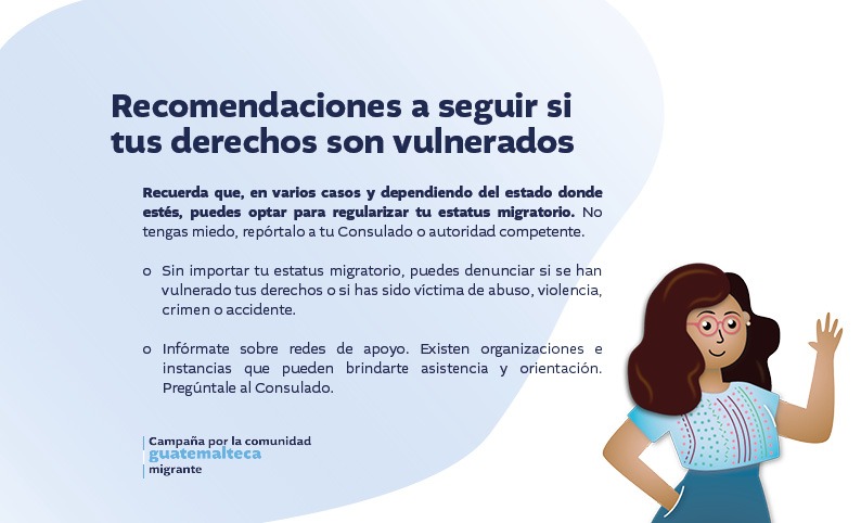 Recuerda que, en varios casos y dependiendo del estado donde estés, puedes optar para regularizar tu estatus migratorio. No tengas miedo, repórtalo a tu Consulado o autoridad competente.