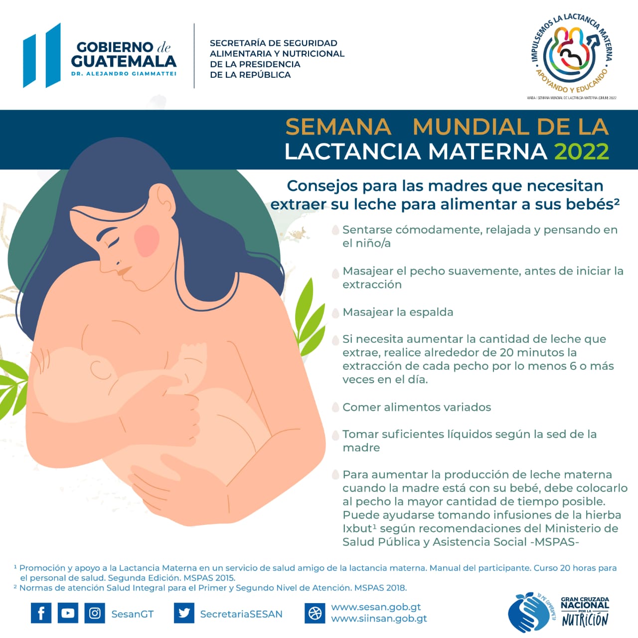 La Secretaría de Seguridad Alimentaria y Nutricional (Sesan), como institución coordinadora de intervenciones que fortalecen la seguridad alimentaria y nutricional de la población guatemalteca, se une a la conmemoración mundial de la lactancia materna durante todo el mes de agosto con actividades y mensajes que buscan fomentar esta práctica, aliada de la nutrición infantil y que además, mejora la salud y bienestar de las madres.