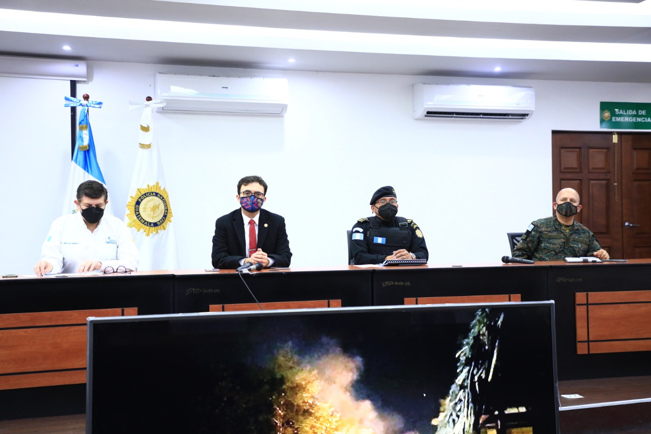 El Secretario de Comunicación Social de la Presidencia, Kevin López Oliva; el director general adjunto de la Policía Nacional Civil (PNC), Edwin Ardiano López; el portavoz del Ministerio de la Defensa, Rubén Téllez; y el director general de Migración, Stuard Rodríguez, ofrecieron una conferencia de prensa en la Dirección General de la PNC, sobre los incidentes ocurridos en la frontera El Corinto. Una caravana de migrantes arremetió contra los agentes de las fuerzas de seguridad.