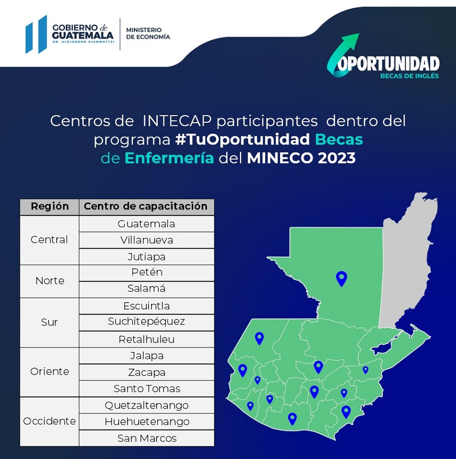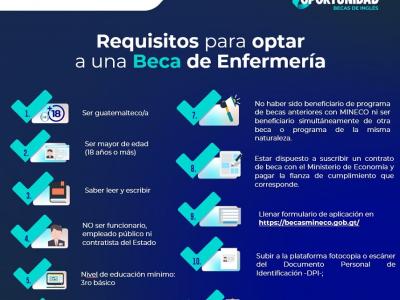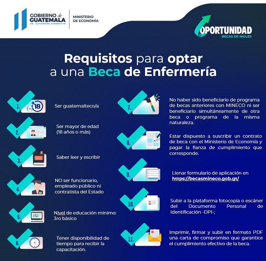 La beca, ofrece la oportunidad de recibir cursos de capacitación en Atención Integral en Enfermería en modalidad 100% presencial con una duración de 150 horas a razón de 6 horas diarias, 2 días a la semana, en los diferentes centros de capacitación del INTECAP distribuidos en el territorio a nivel nacional.