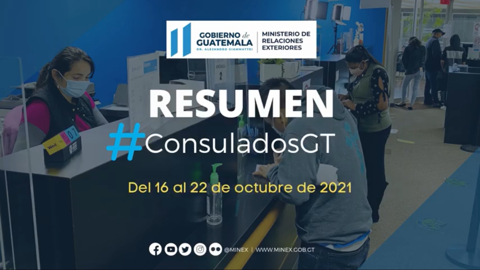 El Ministerio de Relaciones Exteriores de Guatemala comparte el resumen de las actividades realizadas por los distintos Consulados durante la semana del 16 al 22 de octubre del 2021.