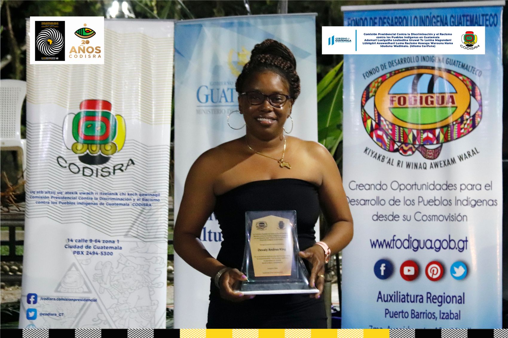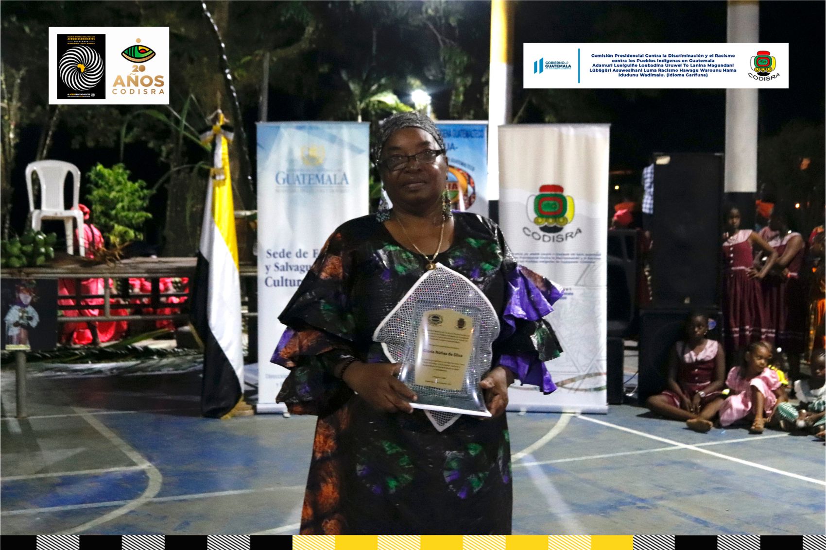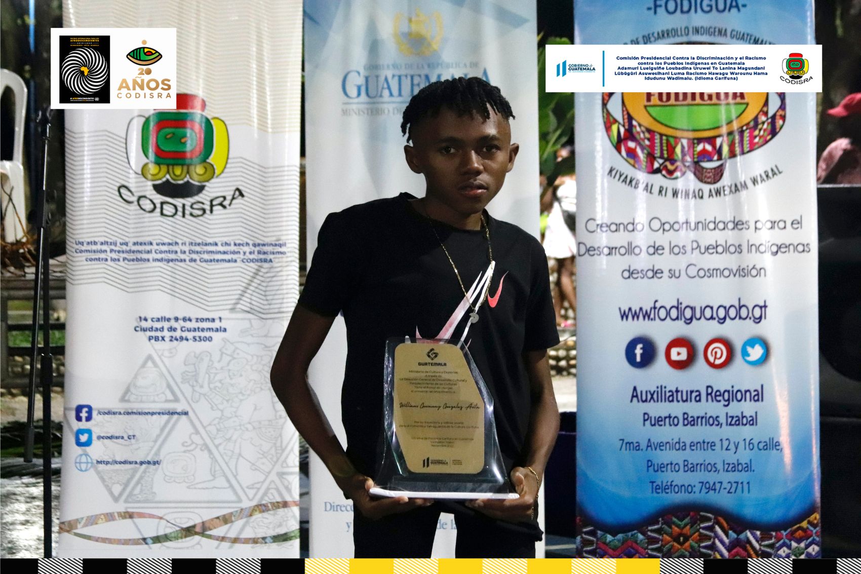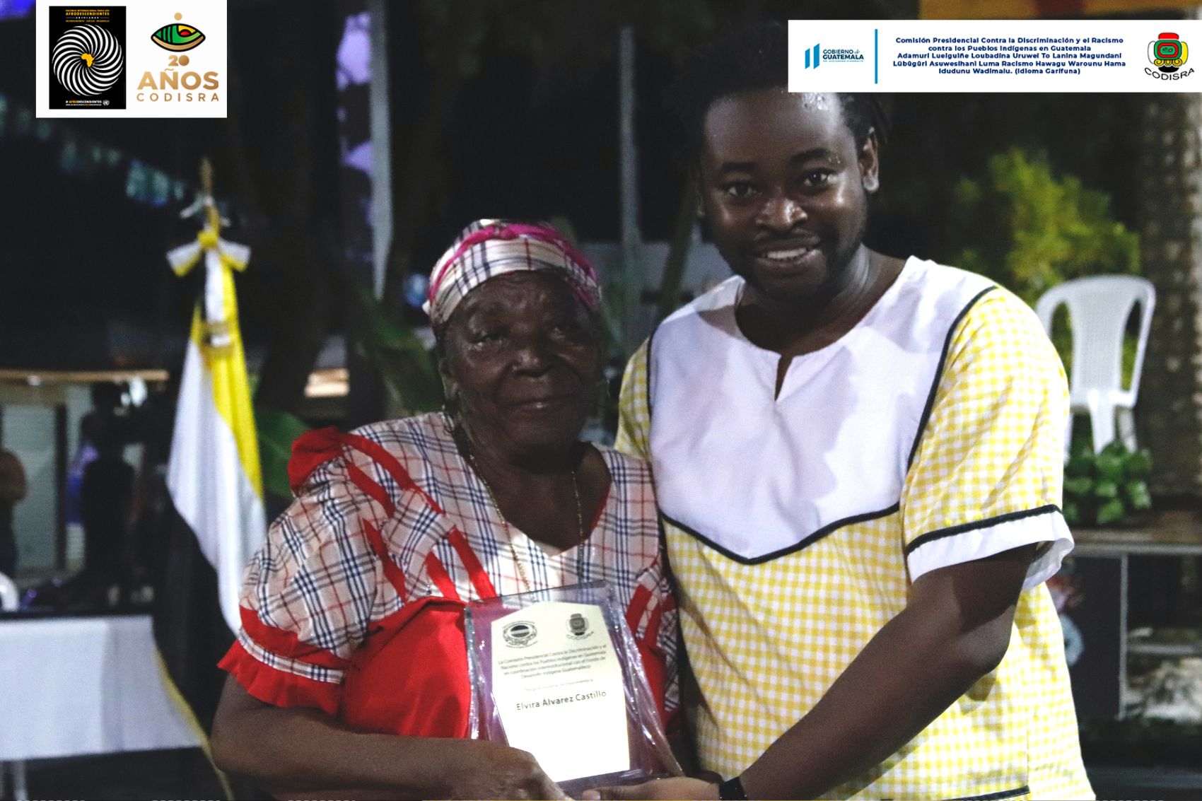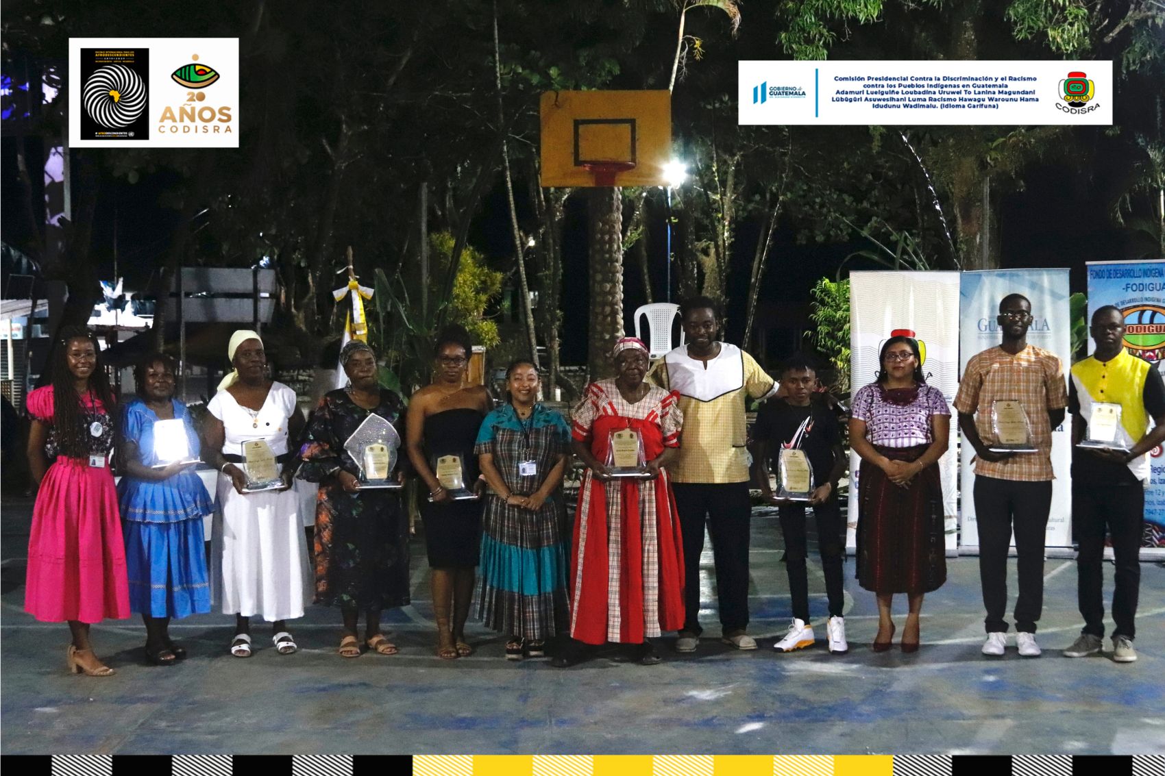 En representacion por parte de la CODISRA, el Comisionado Presidencial Carlos Arana, en la Noche Cultural, en el marco de la conmemoración de los 220 años de la presencia del Pueblo Garífuna en Guatemala, realizo la entrega de los reconocimientos al esfuerzo por destacar y poner en alto el nombre del Pueblo Garífuna, dentro y fuera del país.