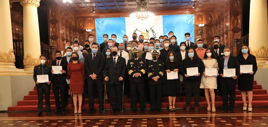 El acto de entrega de diplomas se llevó a cabo en el Palacio Nacional de la Cultura y contó con la participación del Presidente de la República de Guatemala, Alejandro Giammattei; el Ministro de Trabajo y Previsión Social, Rafael Rodríguez; y el Viceministro de la Marina del Ministerio de la Defensa Nacional, Axel David Colindres.