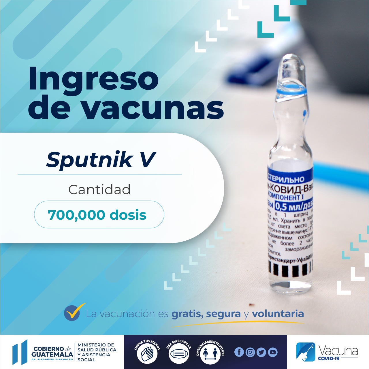 A la fecha, el Ministerio de Salud Pública y Asistencia Social -MSPAS- ha recibido 2.5 millones de vacunas Sputnik V del primer componente y 860 mil del segundo componente. Estas vacunas forman parte de la compra bilateral que realizaron las autoridades del Ministerio de Salud Pública y Asistencia Social -MSPAS- con el Gobierno de Rusia.