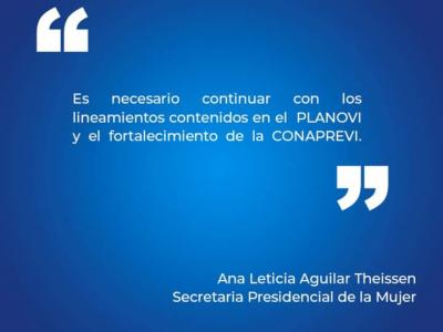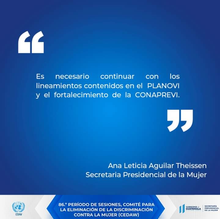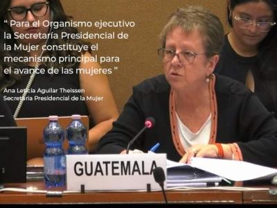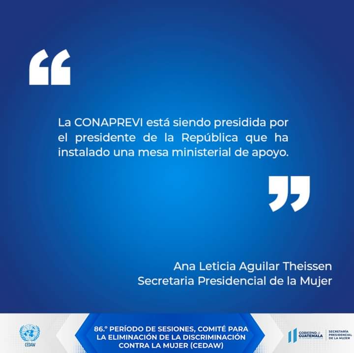 En su discurso inicial, la Secretaria Presidencial de la Mujer, Ana Leticia Aguilar Theissen, dio a conocer los avances que se han tenido por parte del Estado de Guatemala basados en las recomendaciones brindadas por las Expertas en el año 2017. Así mismo abordó los temas en los que como país se ha tenido un des aceleramiento, tomando en cuenta que respecto a la última encuesta de población el 51 % son mujeres.