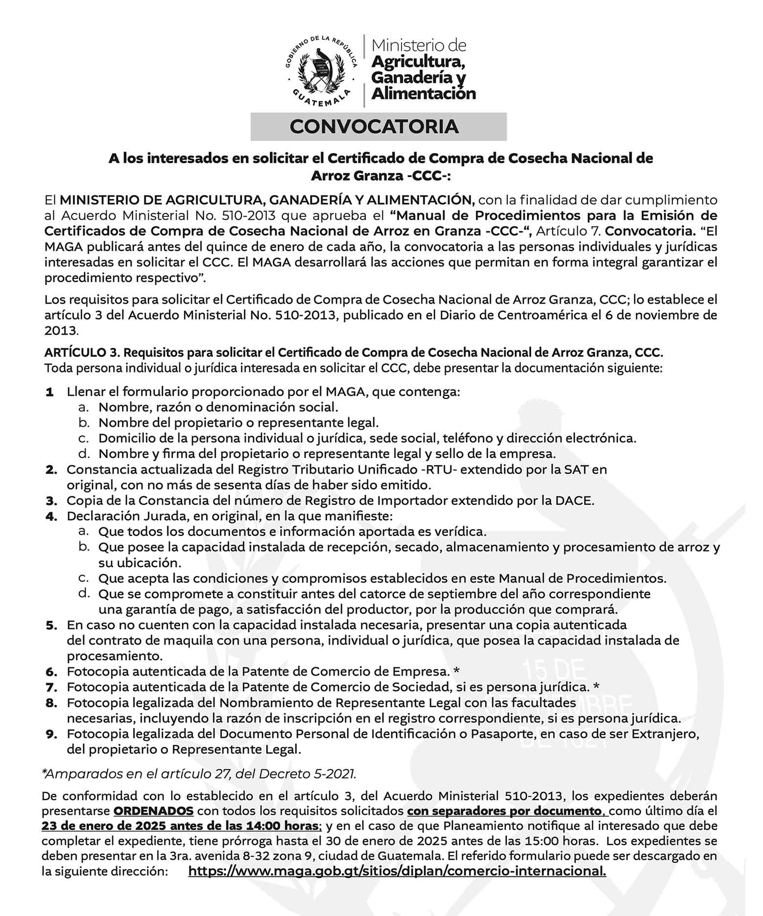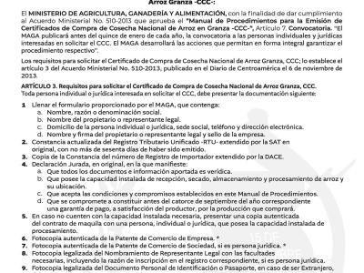 El Ministerio de Agricultura, Ganadería y Alimentación (MAGA), en cumplimiento con el Acuerdo Ministerial No. 510-2013, que aprueba el "Manual de Procedimientos para la Emisión de Certificados de Compra de Cosecha Nacional de Arroz en Granza (CCC)", anuncia la apertura de la convocatoria para la solicitud de Certificados de Compra de Cosecha Nacional de Arroz en Granza.