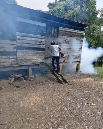 Acciones contra el dengue: salubristas realizan nebulización en viviendas y comercios en comunidad de San Luis, Petén