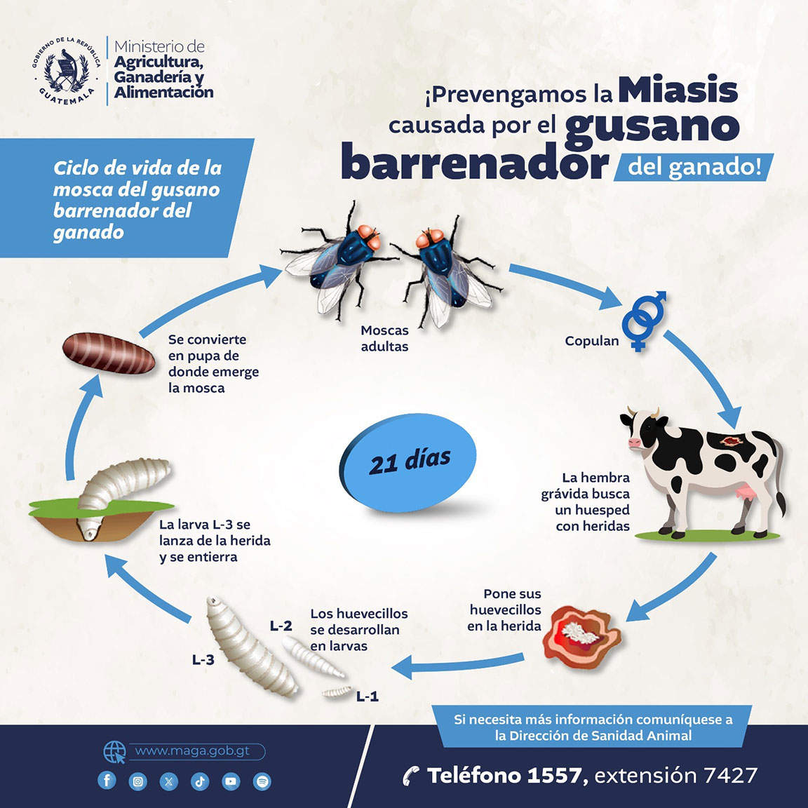 Al respecto, para evitar la miasis causada por el gusano barrenador del ganado, se cuenta con formatos de comunicación clave. El ciclo de vida de la mosca del gusano barrenador es uno de los aspectos que se dan a conocer a la población.