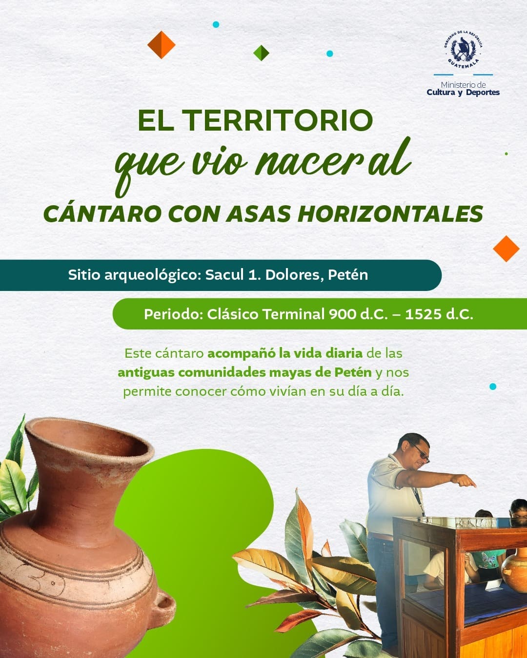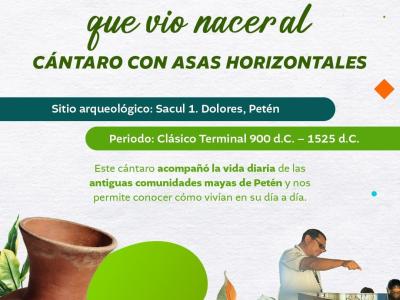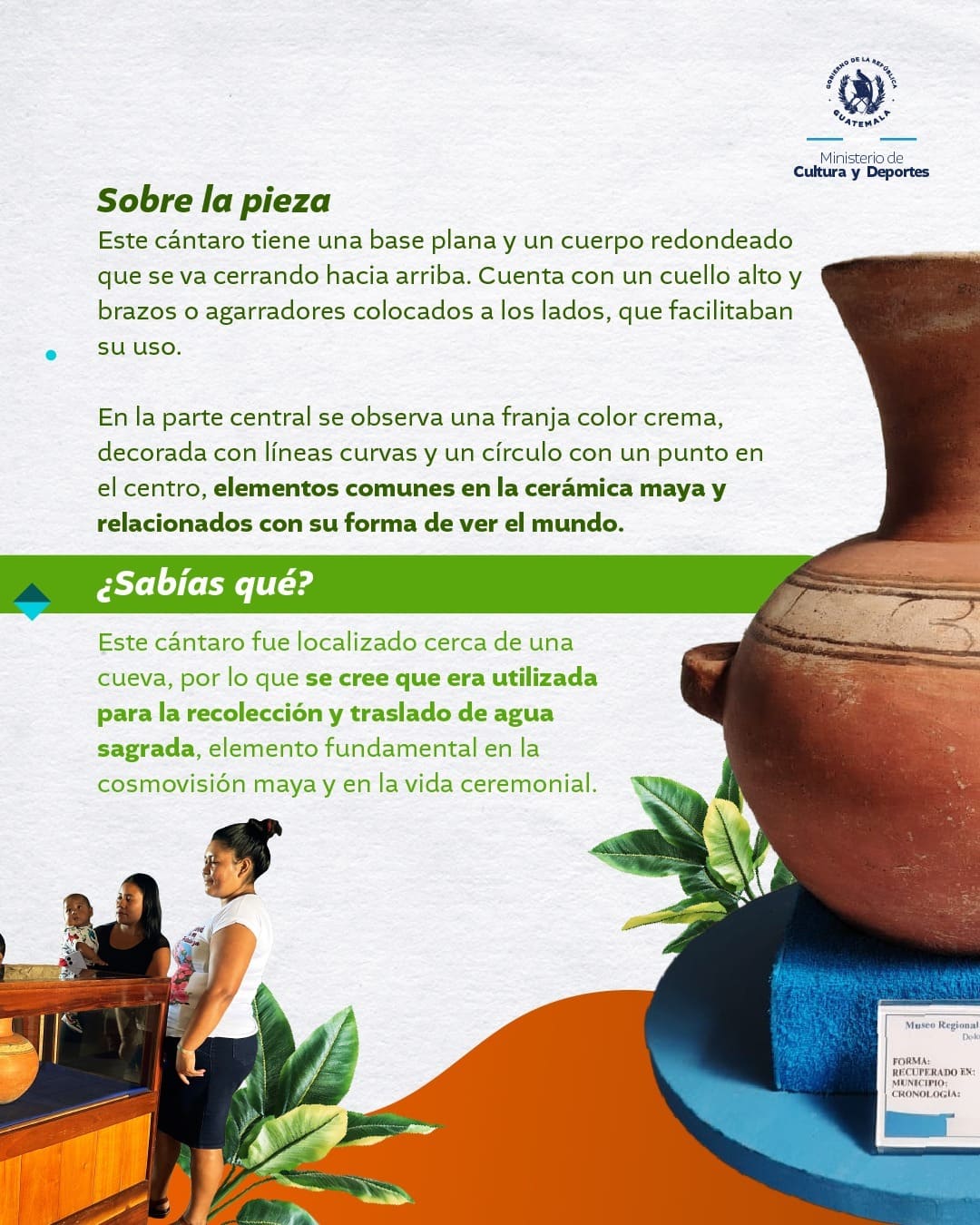 Hoy te invitamos a descubrir este cántaro con asas horizontales, una pieza arqueológica proveniente de Sacul 1, Dolores, Petén, que refleja la vida cotidiana y la espiritualidad de las antiguas comunidades mayas.