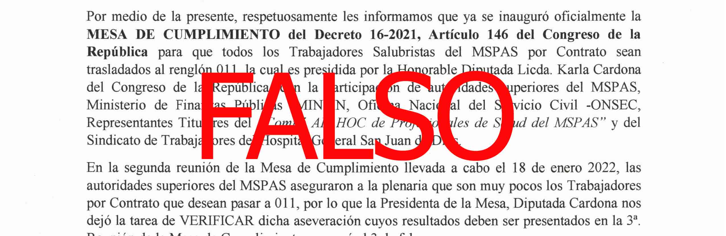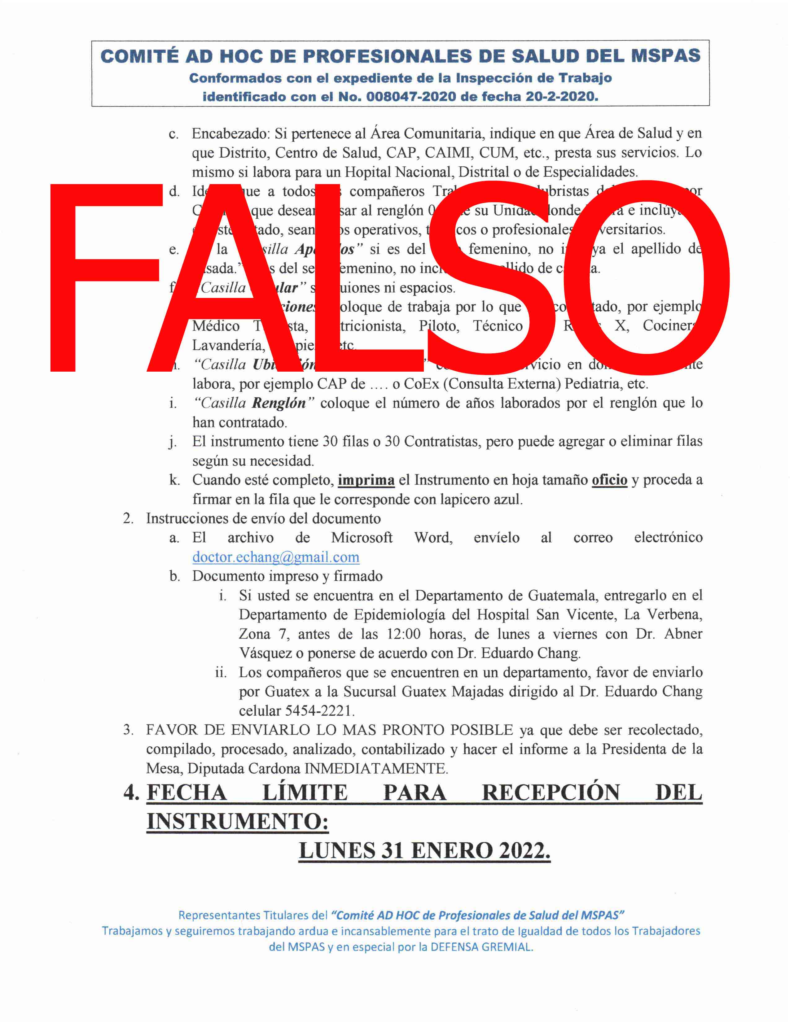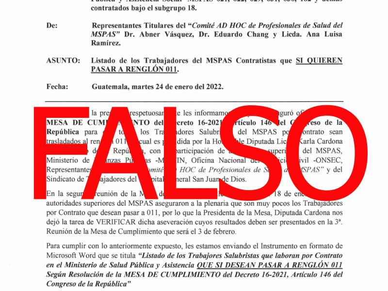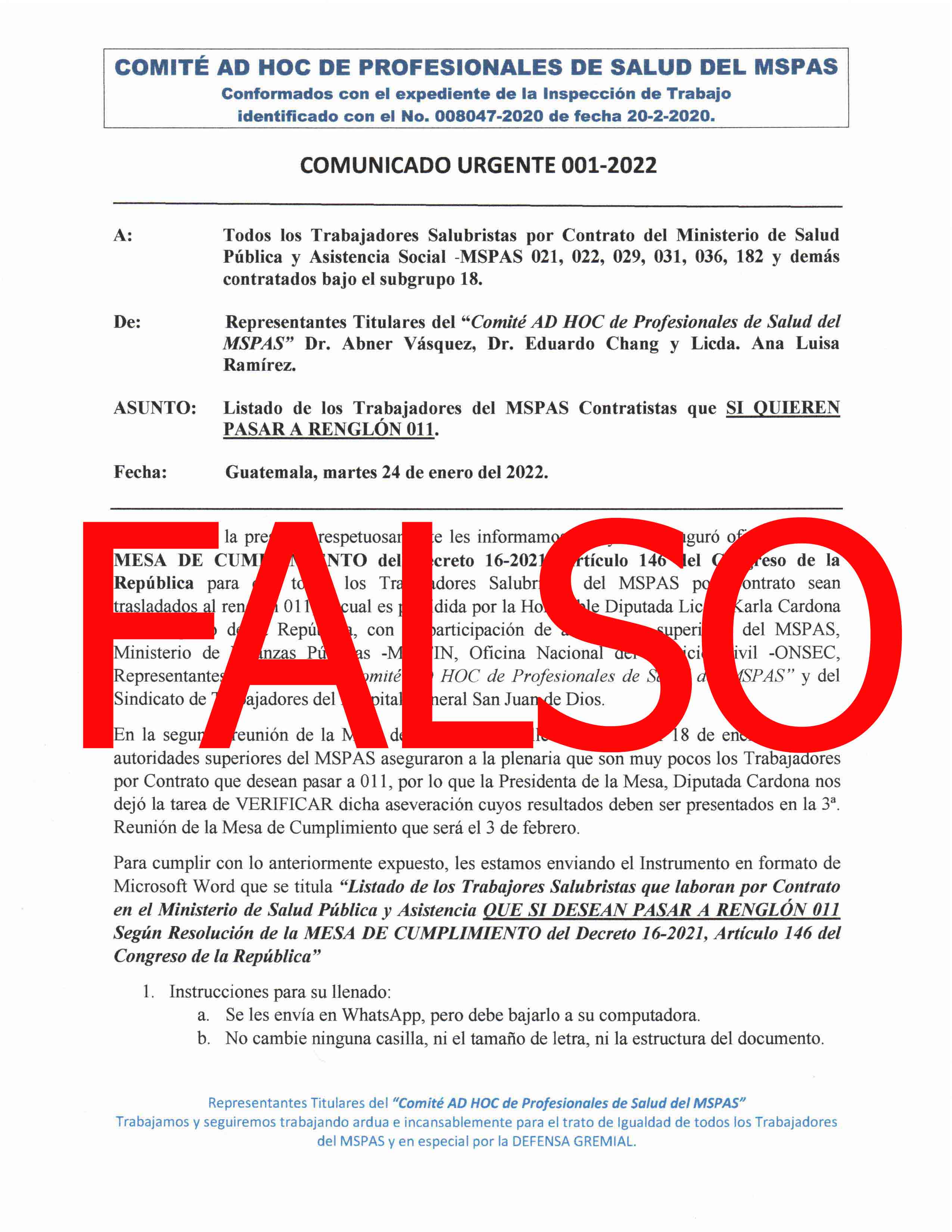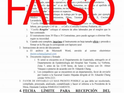 En atención a una serie de comunicados que han estado circulando por diferentes medios de comunicación, es necesario que para conocimiento de todo el personal del Ministerio de Salud Pública y Asistencia Social -MSPAS-, se ACLARE lo siguiente: